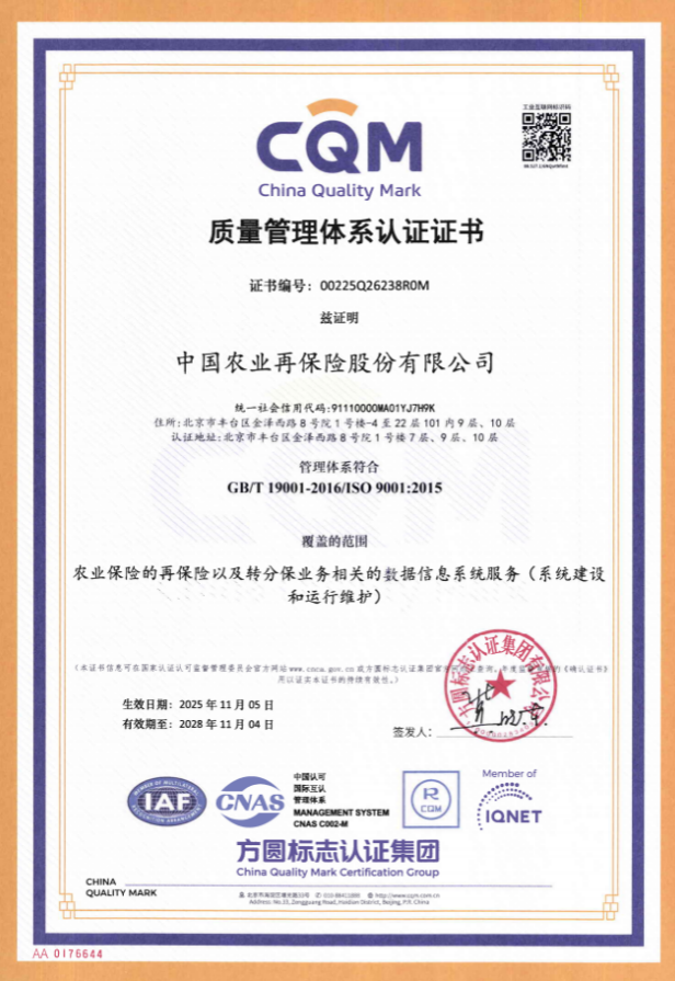 中国农再自成立以来,持续提升信息化建设管理水平。今年,公司组织开展质量管理体系认证工作并通过外部专业认证机构审核,获得了GB/T 19001-2016/ISO 9001:2015质量管理体系认证证书。证书证明公司数据信息系统服务达到了国标和ISO标准,有能力稳定地提供满足用户需求和法律法规要求的信息技术服务。今后,中国农再将继续提升信息化建设质量,持续提升用户满意度,推动公司主责主业高质量发展。